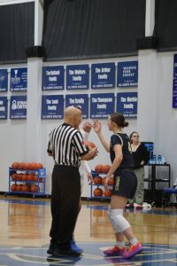 Sophomore, Elizabeth Thompson, jumps for tip off.